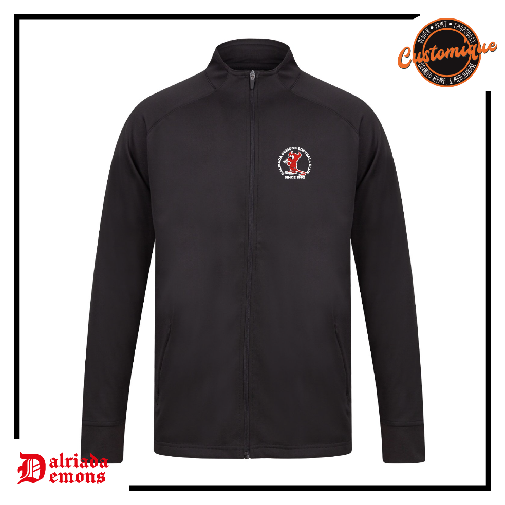 Knitted tracksuit top with contrast colour panels on outer sleeve. Contrast colour centre front zip. Zipped side pockets. Funnel neck and 1x1 ribbed cuffs. Semi-automatic lock zip sliders on all zips. WRAP certified.