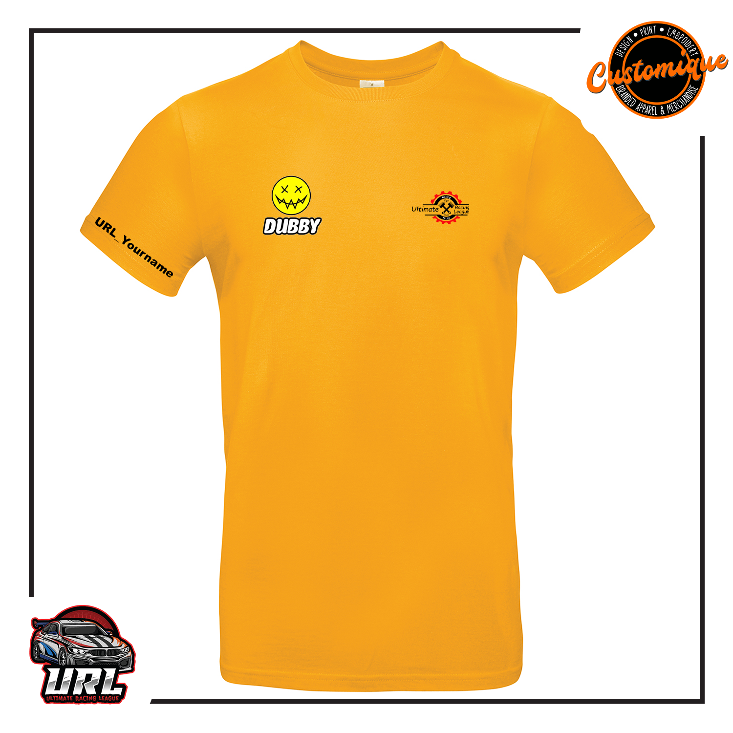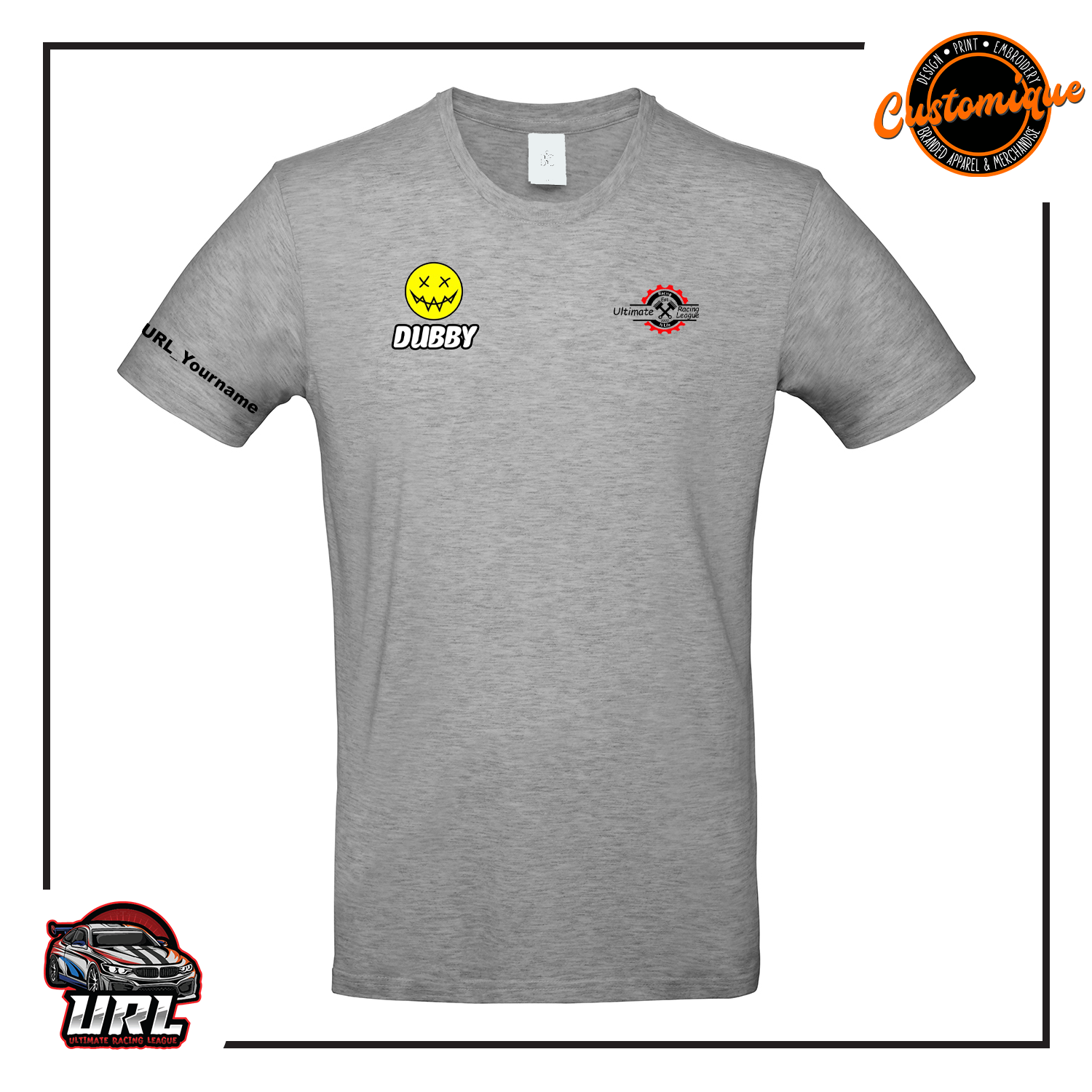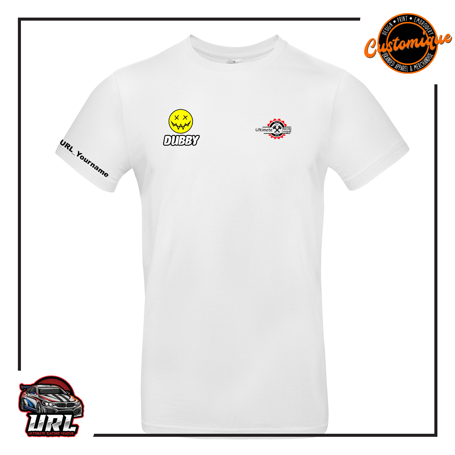 Branded with URL Ultimate Racing League logo on front left chest, Dubby logo on the right chest. New URL Ultimate Racing League logo on the back. Add your own personal URL username on the right sleeve.