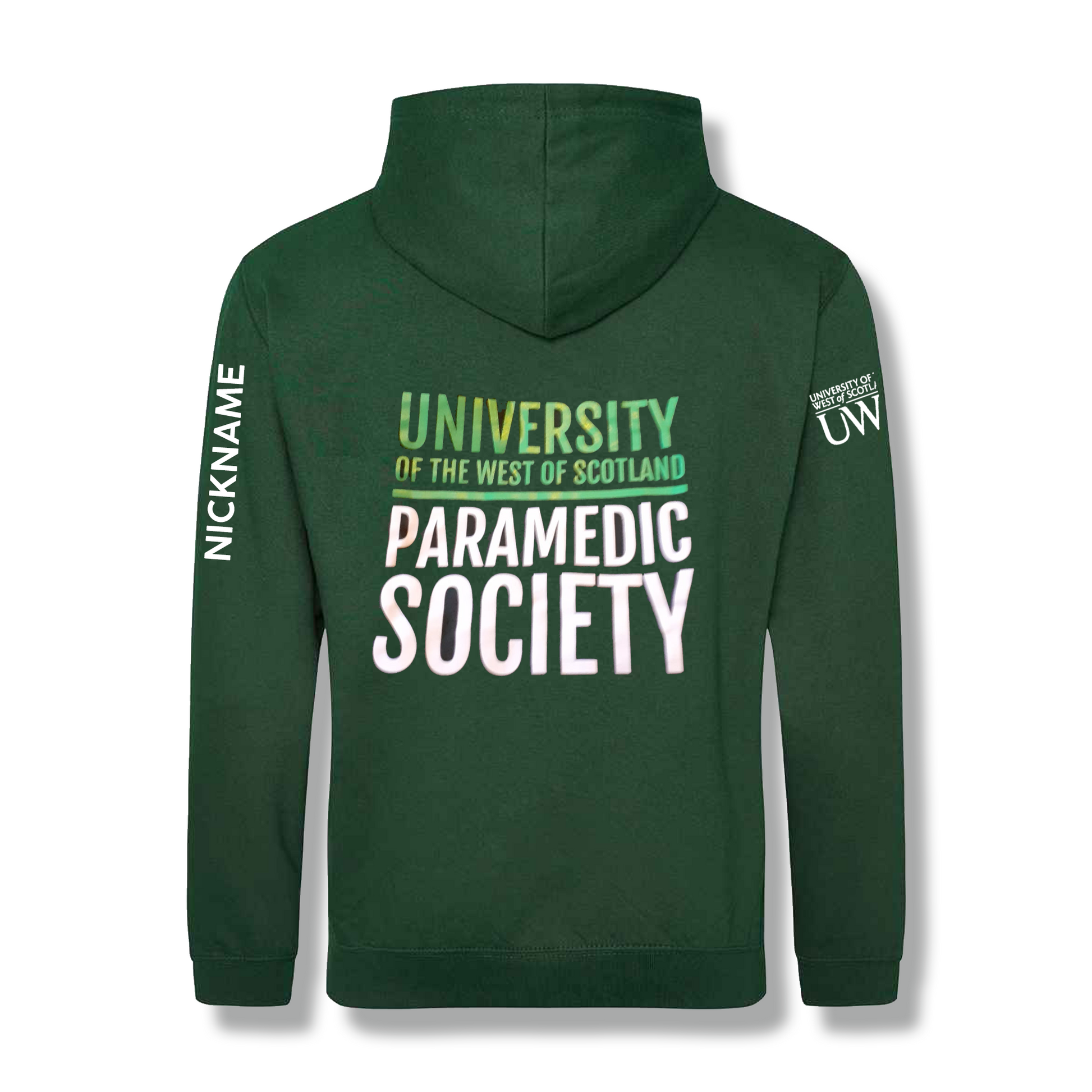 Embroidered with the Paramedic Society logo on the left chest, UWS logo embroidered on the right sleeve. UWS, Paramedic Society printed on the back. Name/nickname printed down the left sleeve. Option to add embroidered name to the front right chest.